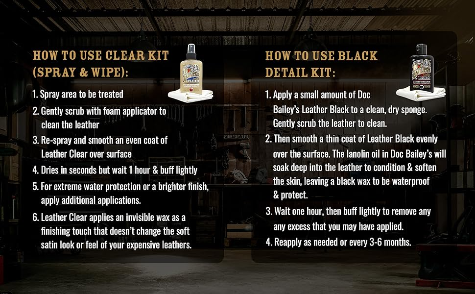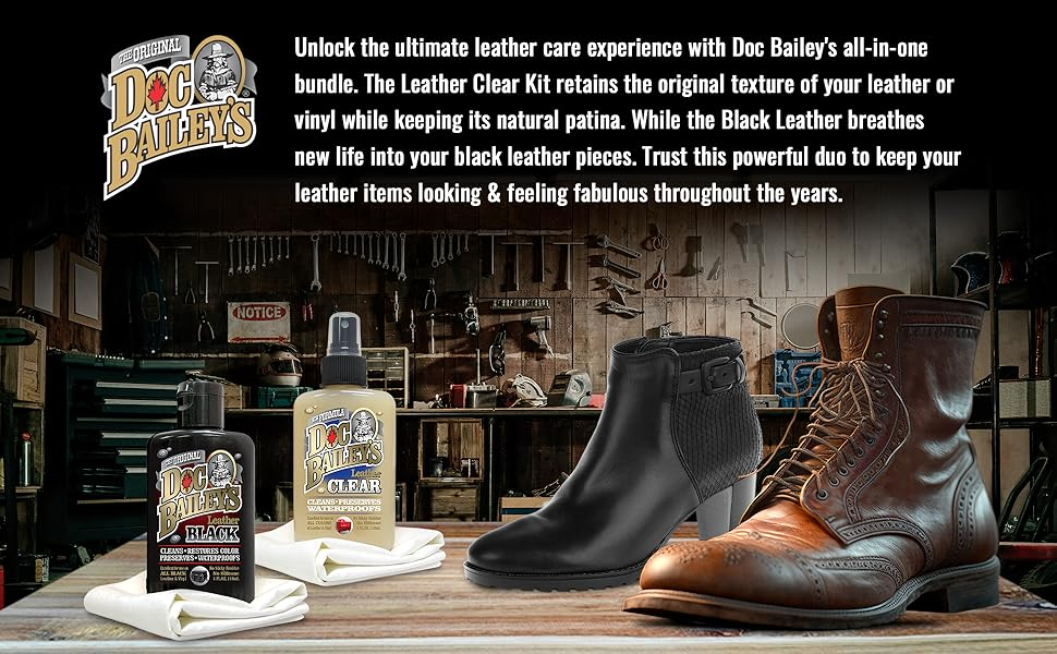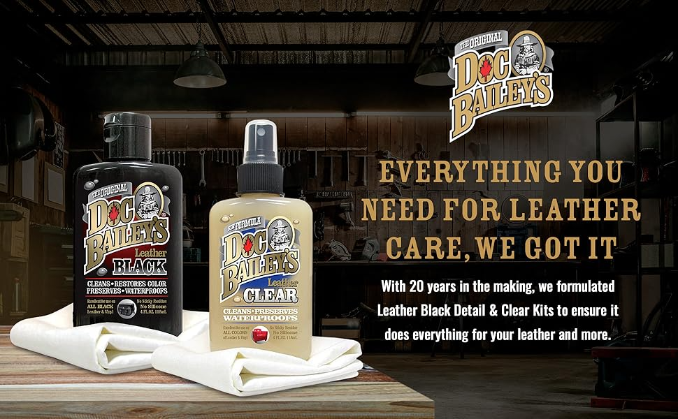 Maintain leather goods with Doc Bailey's Black Leather Care. Our all-in-one formula replaces 4 products: cleaner, conditioner, recolor, and waterproofer. Why buy multiple products when Doc Bailey's covers it all in one easy step.